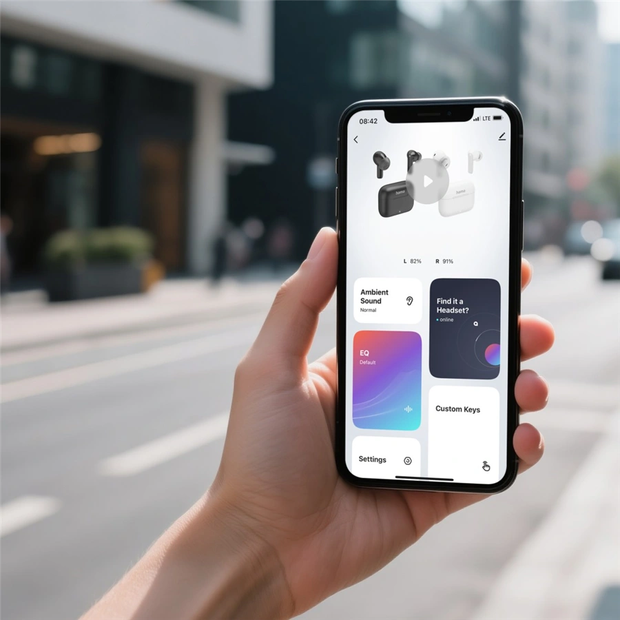 - podrobné nastavení přes aplikaci Hama Smart Home: nastavení ANC, ekvalizéru, hlasitosti, nastavení dotykového ovládání, hledání sluchátek a další