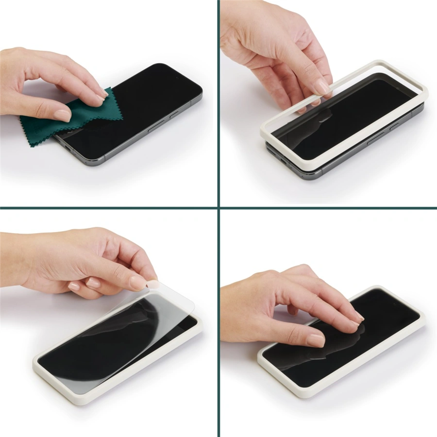 - snadná aplikace ve 3 krocích: vyčistěte displej telefonu, umístěte EcoFrame upevňovací pomůcku na displej a následně umístěte na vrch ochranné sklo