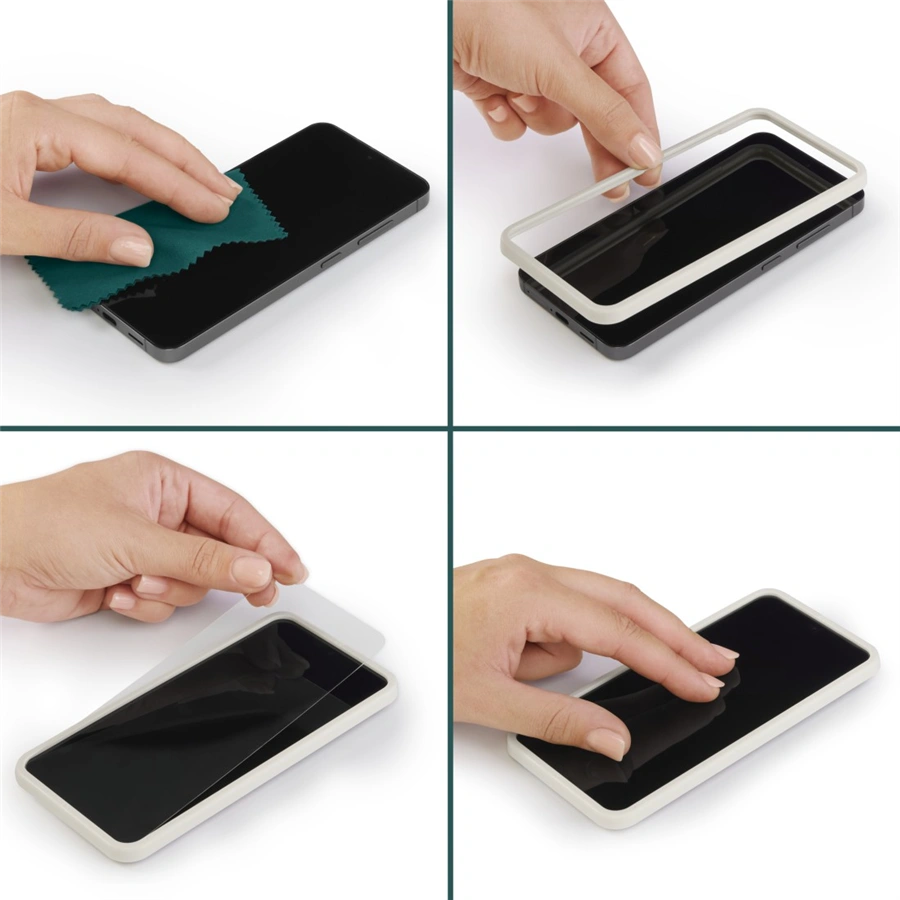 - snadná aplikace ve 3 krocích: vyčistěte displej telefonu, umístěte EcoFrame upevňovací pomůcku na displej a následně umístěte na vrch ochranné sklo