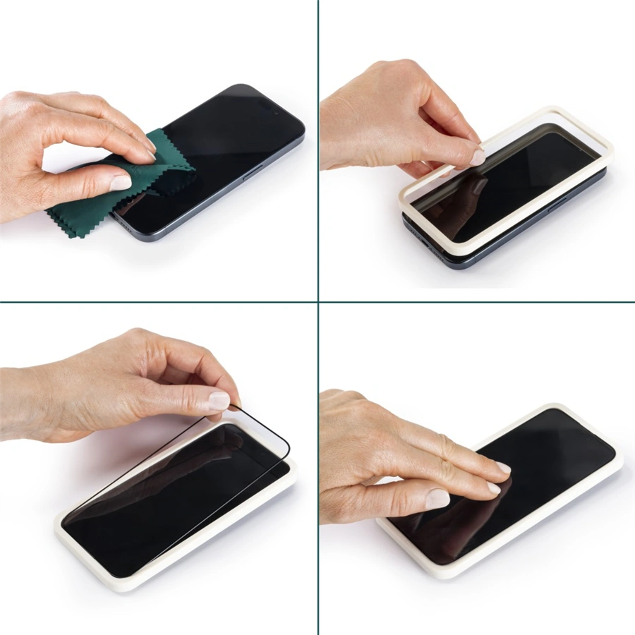 - snadná aplikace ve 3 krocích: vyčistěte displej telefonu, umístěte EcoFrame upevňovací pomůcku na displej a následně umístěte na vrch ochranné sklo