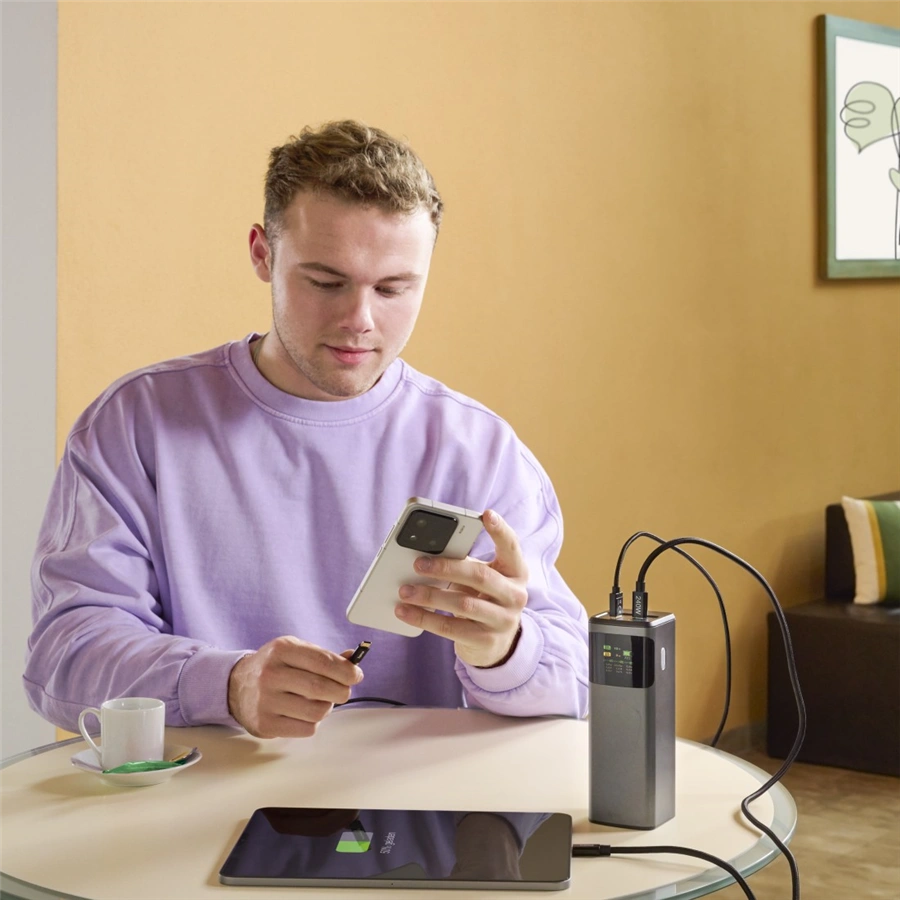 Powerbanka má celkový výstupní výkon max. 150 W. Připojíte-li dvě zařízení k oběma USB-C zásuvkám, výkon každé zásuvky bude 65 W. Připojíte-li zařízení ke všem třem zásuvkám, výkon každé USB-C zásuvky bude 65 W a USB-A zásuvky 18 W.