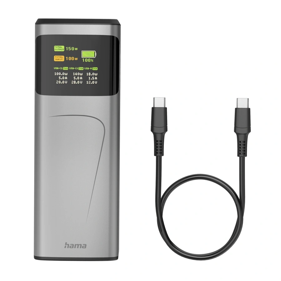 - rychlé nabití powerbanky přes USB-C konektor za 2,1 hodiny pomocí přiloženého USB-C kabelu vhodného pro výkon až 240 W (délka 0,5 m)