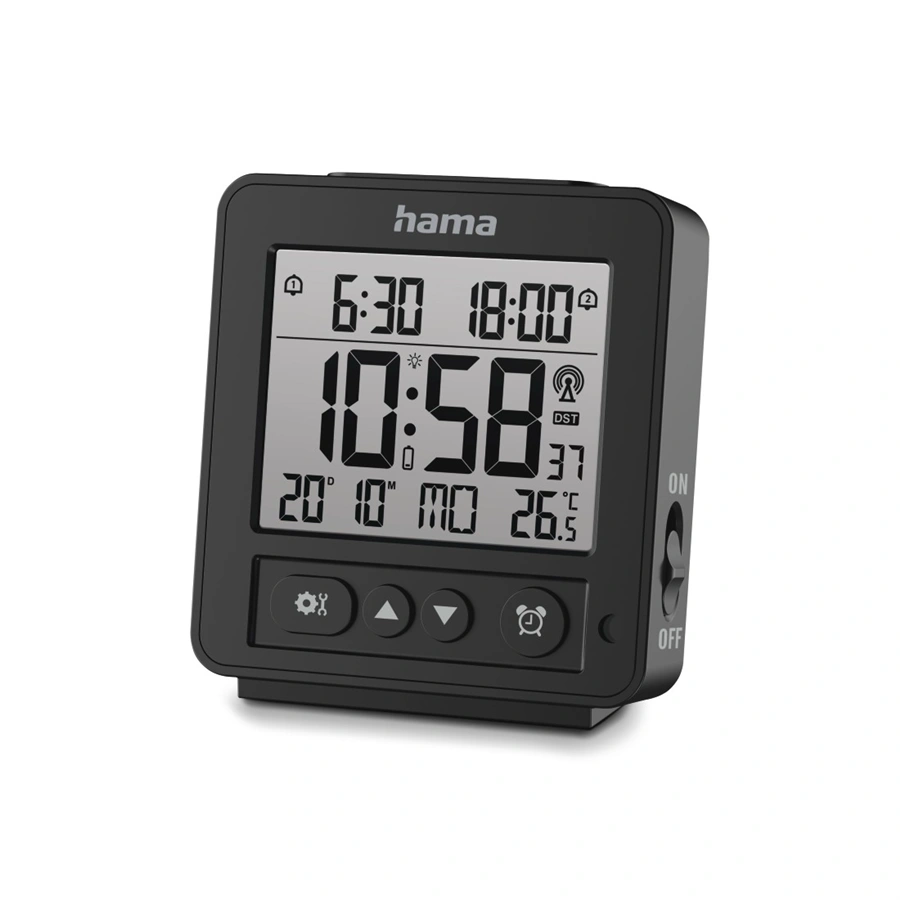 - digitální budík řízený rádiovým signálem DCF (automatické nastavení času podle nejpřesnějších hodin světa)