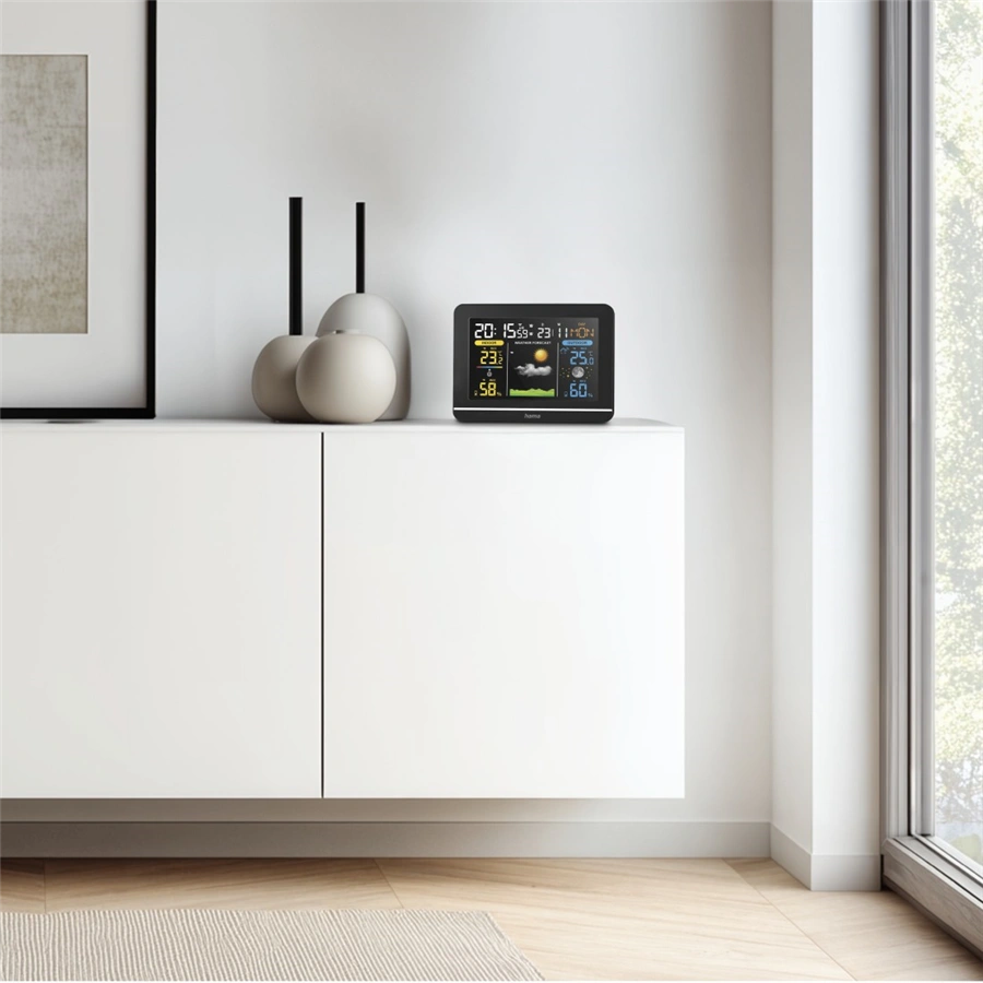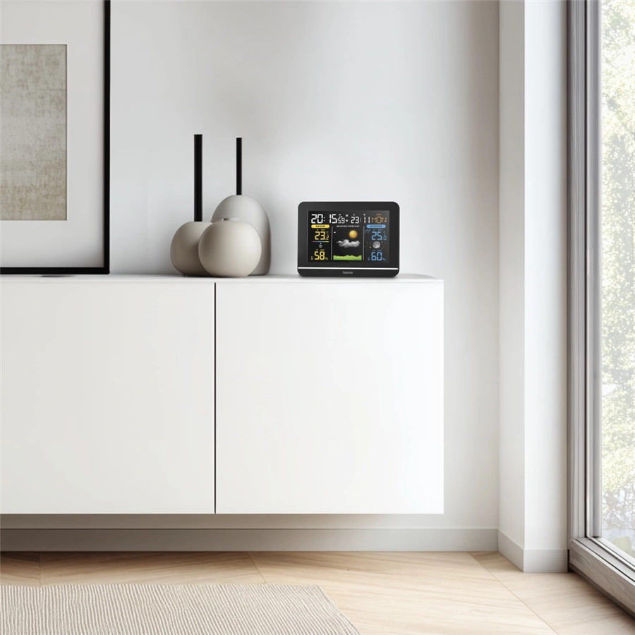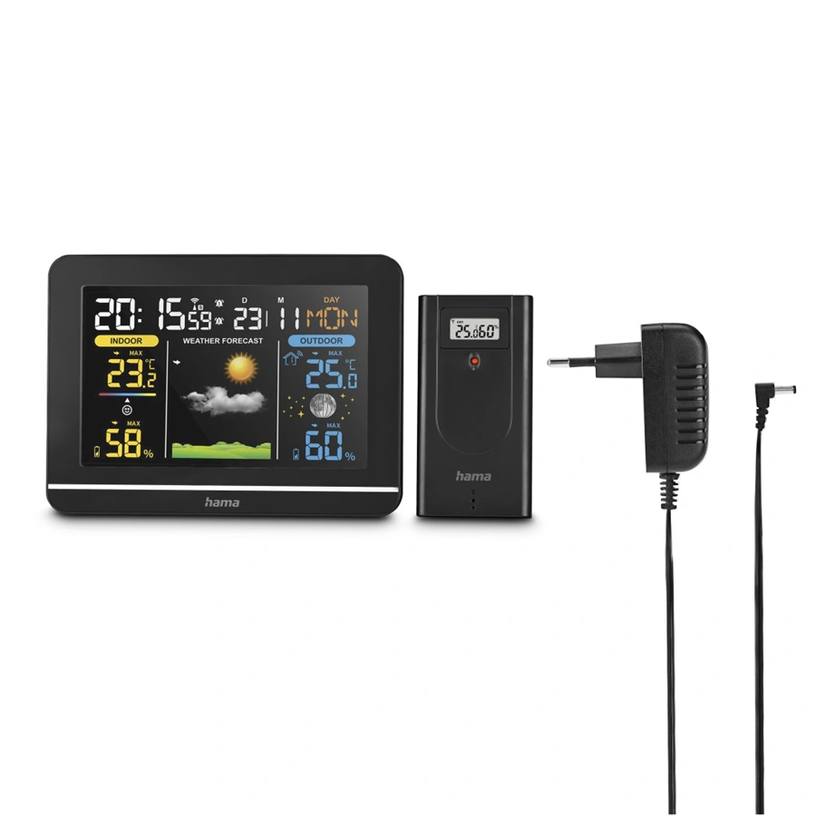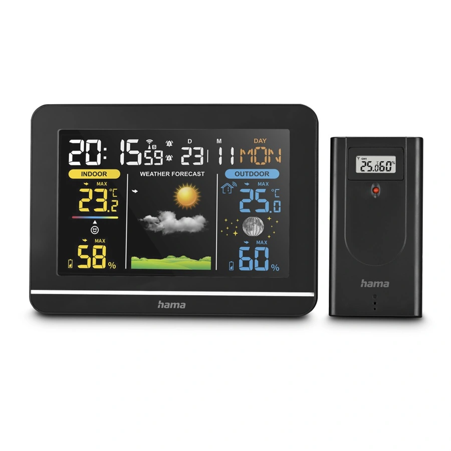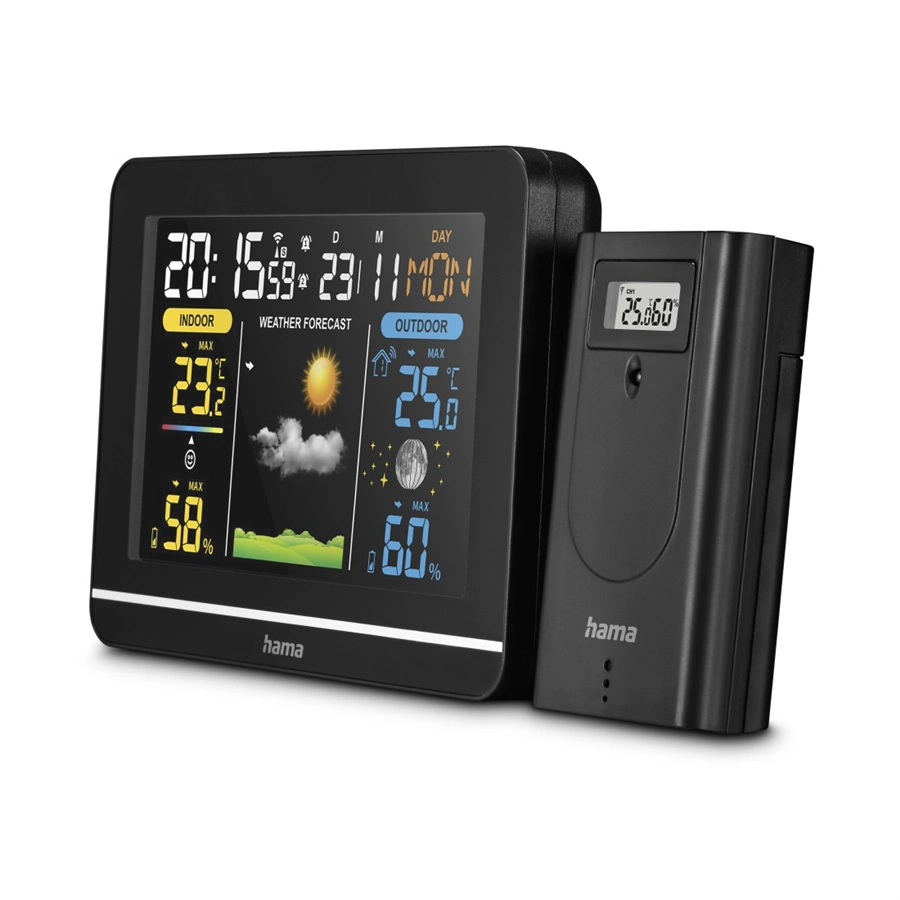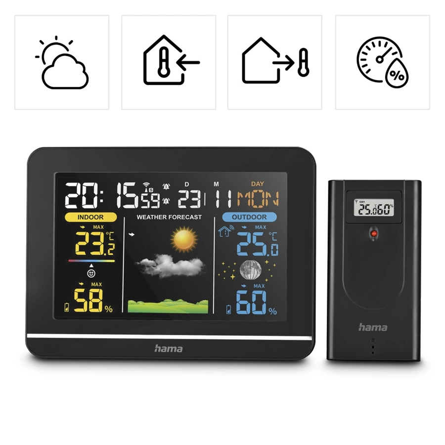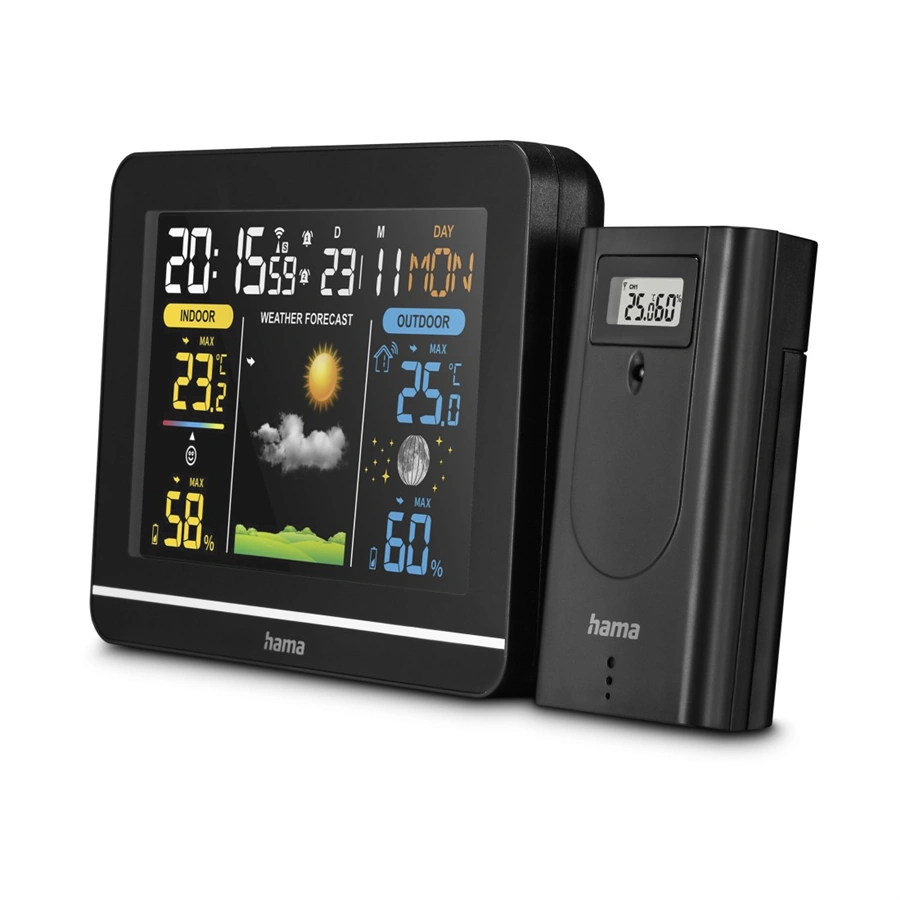 - pro digitální zobrazení venkovní a vnitřní teploty a vlhkosti vzduchu, předpovědi počasí, fáze měsíce, data, času a dne v týdnu
