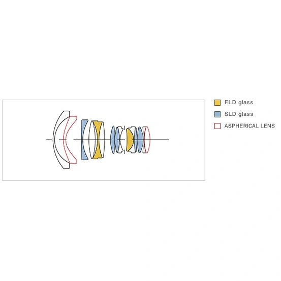 Objektiv se skládá z 15 optických elementů v 11 skupinách s asférický, FLD a SLD členem.