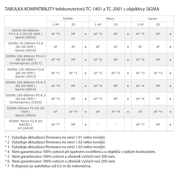 Telekonvertor SIGMA 2x nové generace SGV je kompatibilní s vybranými objektivy SIGMA řad Art, Sports a Contemporary.