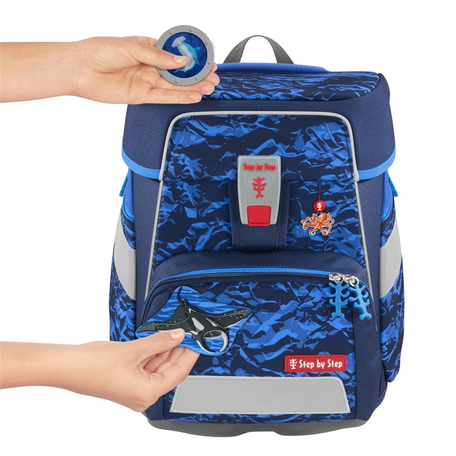 Vyměnitelné obrázky MAGIC MAGS lze z aktovky sejmout a nahradit jinými MAGIC MAGS dle osobního výběru. Díky tomu je každá aktovka jedinečná. Vyměnitelné obrázky MAGIC MAGS lze zakoupit jako samostatný set. Set se skládá ze dvou magnetických obrázků a jednoho přívěšku. Pro neutrální design můžete MAGIS MAGS z aktovky odstranit, aniž by na aktovce zůstaly stopy po lepidle nebo suchém zipu.