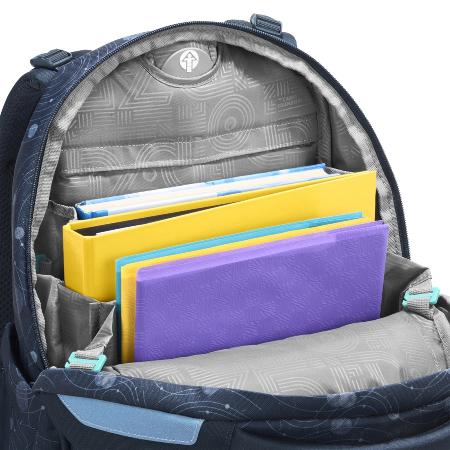 - velká hlavní kapsa s přihrádkou na knihy a odnímatelnou přepážkou, kapsa s organizérem a přední kapsa např. pro svačinovou krabičku