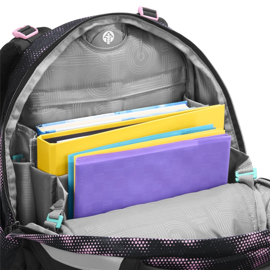 - velká hlavní kapsa s přihrádkou na knihy a odnímatelnou přepážkou, kapsa s organizérem a přední kapsa např. pro svačinovou krabičku