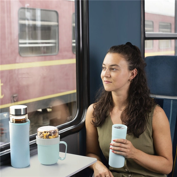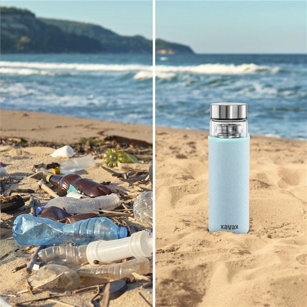 - materiál: sklo (lahev), nerez (sítko, víčko), neopren (obal)